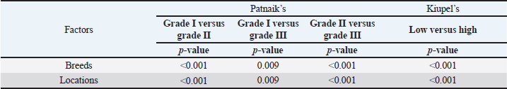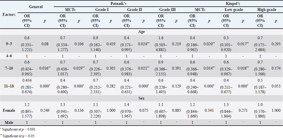 The perigenital area was considered of significant highest risk for having cutaneous MCT (OR=2.5; 95% CI 1.246–4.910) (Table 5). In contrast, buttock area presented a decreased risk for having these neoplasms (OR=0.1; 95% CI 0.040–0.410). In the analysis of the lesions distribution when classified according with Patnaik system, the perigenital area exhibits a substantially greater risk of being affected with a high grading (grade III) lesion (OR=6.6; 95% CI 2.679–16.334) (Table 5). Another location with high OR and high risk for grade III was the trunk (OR=1.9; 95% CI 1.028–3.395). In turn, the limbs were found to be the region with the highest risk for having grade II tumor (OR=1.6; 95% CI 1.134–2.395). Buttock area, head, and neck presented a decreased risk for grade II tumors (OR=0.1; 95% CI 0.010–0.515 and OR=0.4; 95% CI 0.189–0.829, respectively). Based on Kiupel classification, MCTs distribution amongst the different anatomical regions did not display significant values (Table 5). Sex and age-group evaluationData representing the frequency of MCTs in the analyzed canine population considering dog’s sex and the four established age groups are shown in Table 6. The frequency of MCTs is higher in the older age groups (7–0 and 11–18 years, accounting for 40.98% and 26.23%, respectively). In terms of the frequency distribution in the classification systems (Table 6), for Patnaik’s system in grade I, II, and III majority of the frequencies were in the two oldest groups (7–10 and 11–18 years) and in Kiupel’s system, for low grade and high grade, the same distribution occurs. All age groups had majority of cases classified as grade II or lower (Table 6). Female dogs (54.51%) were most affected than males (45.49%). As shown in Table 6, even when analyzing female and male dogs’ distribution within the histological grading’s systems, the same tendency was seen. A difference in mean age was seen between the total MCT group and the reference group; between MCTs classified with the Patnaik classification system and the reference group as well as between MCTs classified with the Kiupel classification system and the reference group (Table S2). For the age group risk evaluation, an analysis comparing the other groups with the youngest dog group (0–3 years) was performed; however, no significant outcome was noted. However, since, the younger group had the lower frequency in comparison with the other groups, we performed another analysis with a different reference group. A risk analysis was performed comparing the others with the group of 4–6 years. In this analysis, we encounter a decreased risk (OR=0.6; 95% CI 0.424–0.965 and OR=0.4; 95% CI 0.281–0.674) for having MCT in the older dogs (from 7 to 10 years and 11 to 18 years, respectively) compared to that in the reference group (4–6 years) (Table 7). There was no significant value for the youngest group of less than 3 years old. In the Patnaik distribution for grade II tumors, all of the groups (0–3, 4–6, and 7–10 years) had a decreased risk in relation to the group of 4–6 year-old dogs (OR=0.4; 95% CI 0.171–0.995; OR=0.6; 95% CI 0.376–0.983 and OR=0.4; 95% CI 0.221–0.631, respectively) (Table 7) For the Kiupel distribution in the low-grade tumors, there was also a decreased risk for all the groups (0–3, 4–6, and 7–10 years) (OR=0.3; 95% CI 0.101–0.920; OR=0.6; 95% CI 0.329–0.967 and OR=0.4; 95% CI 0.211–0.677, respectively) (Table 7). There was not noted risk for gender. Table 3. ORs and 95% CIs for MCT in various dog breeds according to the Patnaik’s and Kiupel’s grading system. (p) p-value. 2-sided Fisher exact test.