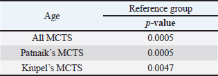 Table 7. ORs and 95% CIs for MCT for age and sex according to Patnaik and Kiupel’s classification system. (p) p-value. 2-sided fisher exact test.