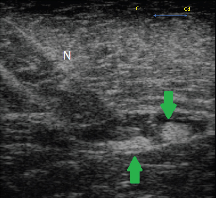 Fig. 2. Transverse ultrasound image showing the needle (N) and the sciatic nerve (arrows), identified as two ellipsoid structures deep to the biceps femoris muscle. At the end of the procedure, the patient experienced an uneventful recovery. Post-operative analgesia was provided with 0.01 mg/kg buprenorphine (Buprecare ®0.3 mg/ml, Animalcare, York, UK) IV every 8 hours and 0.5 mg/kg meloxicam (Metacam ®20 mg/ml, Boehringer Ingelheim, Berkshire, UK) IV once daily. The patient was standing, passing feces, and showing an interest in food 90 minutes following the end of anesthesia . Based on physical and behavioral assessment from a specialist farm animal clinician, pain was deemed to be well controlled . Buprenorphine was discontinued 24 hours later, while meloxicam continued at the same dose. Due to reduced interest in food 72 hours post-operatively, a blood sample was taken that showed an elevation in potassium (5.9 mmol/l; reference range 2.5–5.2), aspartate aminotransferase (1,114 U/l; reference range 175–340), creatine kinase (4,271 U/l; reference range 120–470), urea (23.5 mmol/l; reference range 2.5–8.9), and creatinine (411 umol/l; reference range 53–194). At this stage, the patient was anuric and renal insufficiency was suspected; however, attempted medical treatment with IV isotonic fluid and IV furosemide administration was unsuccessful. Euthanasia was performed 6 days following surgery. Post -mortem examination revealed reddened ileal and caecal mucosa, with fluid large intestinal contents. A moderate volume of serosanguineous peritoneal fluid was also present. On histopathology of the kidney, muscle, and liver, no signs of rhabdomyolysis were observed; however , changes were consistent with disseminated intravascular coagulation. This was likely secondary to bacterial toxins originating from the intestines. Renal insufficiency was most likely secondary to these findings.