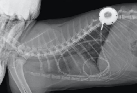 Fig. 4. Day 6: left lateral view of thorax showing placement of a pleural port device with partial resolution of pyothorax. The cat was discharged on day 7, after it had started eating. The client was instructed to carry out an aseptic lavage twice daily with 50 ml of sterile saline solution at home. Following lavage and draining of the pleural space, the catheter was injected with 3–5 ml of heparinized (heparin 100 IU/ml) sterile saline after each use to avoid clotting and ensure patency. Doxycycline 5 mg/kg PO q24 hours, (Apo-Doxy, Apotex Inc., North York, ON) for 15 days and buprenorphine (Temgesic, Schering-Plough Limited, Hatfield, UK) 0.02 mg/kg PO q12 hours for 5 days were prescribed on discharge. At a revisit on day 15, the cat was very bright, had been eating well and gaining weight, appeared fully recovered with no fever, had no abnormal breathing effort, and had a normal respiratory (22 breaths per minute) and heart rates (145 beats per minute). The client reported the drain had remained patient when flushed and aspirated. Minimal excess of fluid (5–10 ml) had been collected from day 6 that had decreased and stopped in the last 2 days before the recheck visit. A blood test (Table 1) showed further stabilization of the hematocrit, mild monocytosis, and a normal ALB. Radiographs of the thoracic region showed resolution of the pyothorax. Cytology was repeated in-house after pleural space lavage that showed absence of bacterial infection. The esophagostomy tube was removed, and the lavage of the thorax was stopped after that day. Oral antibiotics were continued until finished, and no other medication was prescribed. At a follow-up visit 1 month later, on day 44, the cat was very bright, had been eating well, gained weight, and had normal physical exam findings. The blood test was unremarkable (Table 1), and radiographs of the chest showed no pleural effusion. The implant was in place, and its removal was suggested to the client if desired or if complications were observed. Ethical approvalThere were no ethical concerns with the collection of data or with the management of the case. All data used in this manuscript were collected in a retrospective manner. The clients and owners of the animal approved the management of the case and this report. DiscussionThe present case describes the treatment of feline pyothorax using a pleural port device, a treatment approach that has not been reported previously for this purpose. Needle thoracocentesis is often a less efficient treatment when the patient is not suitable for general anesthesia or the clients decline more invasive procedures. The placement of a pleural port to manage pleural effusions is similar in principle to the placement of thoracostomy tubes. They both generally require chemical restraint for an appropriate placement, as shown in up to 100% of cats in one study (Valtolina and Adamantos, 2009). The surgical time for placement of this device has been reported to be around 30 minutes (Brooks and Hardie, 2011). A low-profile thoracostomy tube can be placed in a shorter time and under sedation, yet 36% of procedures took longer than 10 minutes in a referral setting (Valtolina and Adamantos, 2009). In the present case, an esophagostomy tube was also requested; therefore, general anesthesia was imperative if the cat’s condition allowed it. Therefore, the placement of the pleural port device for that matter was also agreed upon. Hospitalization times are an advantage when a pleural port device is used compared to the placement of thoracostomy tubes with shorter mean hospitalization times of as little as 24 hours as it occurred in the present case (Valtolina and Adamantos, 2009; Brooks and Hardie, 2011; Cahalane and Flanders, 2012). Hospitalization time and the extensive cost associated with a lengthier stay at an ICU were minimized, which was a deciding factor for the client. Coiling and kinking of the tubing can occur, and the author has experienced that coiling easily occurs even after cutting and shortening the fenestrated part of the tube. Shortening the tube further might limit its draining potential and coiling has not stopped the drainage efficiency in the past in the author’s experience. Kinking, however, can occur at the point of entrance of the tube into the chest and for addressing that problem; in the experience of the author, softening the angles of introduction has given better results. Postoperative complications were not encountered in this case but have been reported elsewhere and include clogging or kinking of the tube, inflammation, iatrogenic infection, and pneumothorax (Cahalane et al., 2007; Brooks and Hardie, 2011). The specific use of pleural ports for pyothorax has not been reported, and there is scarce information with only a single comment about discouraging its use (Culp, 2015). A highly cellular exudative effusion such as the pyothorax reported here might predispose blockage of the drains. However, lavage of the pleural cavity and dilution of the exudate might have facilitated the drainage in this case. Although the author acknowledges the controversy of its use, other studies have reported the efficacy of similar implants where bacterial or fungal infections were also present (Cray et al., 2018; McQuitty and Branter, 2018). Additionally, a potential advantage of the pleural port device is the decreased risk of ascending nosocomial infections into the pleural space compared to needle drainage or thoracostomy tubes since the hub port is placed subcutaneously. More serious complications of pleural port placement include pulmonary parenchymal puncture and pneumothorax which have been reported as a cause for euthanasia (Brooks and Hardie, 2011). The use of newer, narrower tubes made of silicone reduced that risk considerably compared to trocar-induced thoracostomy (Cahalane et al., 2007; Valtolina and Adamantos, 2009). The use of a pleural port eliminated inflammation and discomfort associated with 