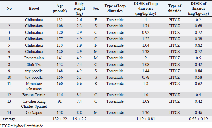 AcknowledgementsThe authors would like to thank Editage (www.editage.com) for English language editing. Author contributionsDr. Koji Iwanaga and Dr. Ryuji Araki collected data and prepared the manuscript. Dr. Isaka and approved the final version. Conflict of interestThe authors declare that there is no conflict of interest. ReferencesAtkins, C.E. and Häggström, J. 2012. Pharmacologic management of myxomatous mitral valve disease in dogs. J. Vet. Cardiol. 14, 165–184. Borgarelli, M. and Haggstrom, J. 2010. Canine degenerative myxomatous mitral valve disease: natural history, clinical presentation and therapy. Vet. Clin. North. Am. Small. Anim. Pract. 40, 651–663. Borgarelli, M., Savarino, P., Crosara, S., Santilli, R.A., Chiavegato, D., Poggi, M., Bellino, C., Rosa, G.L., Zanatta, R., Haggstrom, J., Tarducci, A. 2008. Survival characteristics and prognostic variables of dogs with mitral regurgitation attributable to myxomatous valve disease. J. Vet. Intern. Med. 22, 120–128. Dettli, L. and Spring, P. 1966. Therapy with combinations of diuretic agents: comparative studies. Ann. N. Y. Acad. Sci. 139, 471–480. Dormans, T.P. and Gerlag, P.G. 1996. Combination of high-dose furosemide and hydrochlorothiazidee in the treatment of refractory congestive heart failure. Eur. Heart. J. 17, 1867–1874. Ellison, DH. 1991. The physiologic basis of diuretic synergism: its role in treating diuretic resistance. Ann. Intern. Med. 114, 886–894. Jentzer, J.C., DeWald, T.A. and Hernandez, A.F. 2010. Combination of loop diuretics with thiazide-type diuretics in heart failure. J. Am.Coll. Cardiol. 56, 1527–1534. Keene, B.W., Atkins, C.E., Bonagura, J.D., Fox, P.R., Häggström, J., Fuentes, V.L., Oyama, M.A., Rush, J.E., Stepien, R. and Uechi, M. 2019. ACVIM consensus guidelines for the diagnosis and treatment of myxomatous mitral valve disease in dogs. J. Vet. Intern. Med. 33, 1127–1140. Kim, G.H. 2004. Long-term adaptation of renal ion transporters to chronic diuretic treatment. Am. J. Nephrol. 24, 595–605. Robson, A.O., Kerr, D.N., Ashcroft, R. and Teasdale, G. 1964. The diuretic response to frusemide. Lancet 2, 1085–1088. Sica, D. A. and Gehr, T.W. 1996. Diuretic combinations in refractory oedema states: pharmacokinetic-pharmacodynamic relationships. Clin. Pharmacokinet. 30, 229–249. Vánky, F., Broquist, M. and Svedjeholm, R. 1997. Addition of a thiazide: an effective remedy for furosemide resistance after cardiac operations. Ann. Thorac. Surg. 63, 993–997. | ||
