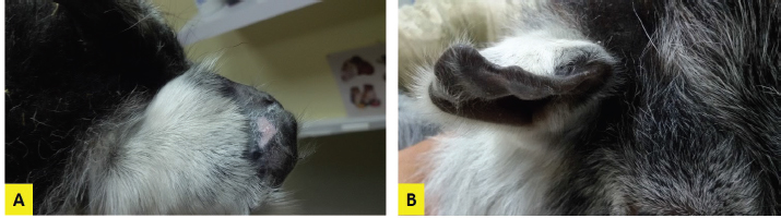 Fig. 6. Lateral (A) and frontal (B) view of the right ear pinna of the goat kid of Figure 2 2 months after surgery. At admission, the kid was generally in good condition. Apart from the observed lesions at both ears, the only remarkable findings at the clinical examination were moderate depression and mild hypothermia. The latter is attributed to the low blood glucose concentration (Abdolvahabi et al., 2016), probably because of reduced appetite. On the other hand, depression could be possibly associated with pain and hypoglycemia. In order to confront with the pre-existing hypoglycemia—hypothermia and to prevent further worsening of this condition during anesthesia, it was selected to use a heat pad, to cover the kid with double layer cotton surgical drapes and to administer 2.5% dextrose solution intravenously (Abrahamsen, 2008). The anesthetic protocol used in this case provided an adequate depth of anesthesia throughout the followed procedures, and the recovery was completed without complications. According to Abrahamsen (2008), the selected combination of anesthetics generally produces 30–40 minutes of recumbency. However, the recumbency in this goat kid lasted longer, probably because of the pre-existing depression and the administration of the highest suggested dosage of xylazine for this protocol (Abrahamsen, 2008). Based on the asymmetry observed between the medial and the lateral surface of the ear pinna and the more intense fluctuation at the convex surface, we concluded that the fluid-filled cave was formatted between the cartilage and the skin of the convex surface. This contrasts with the typical site for dogs (Macphail, 2016) and the former reports for ruminants where the blood accumulation was observed in the concave surface (Tsioli et al., 2013; Dewangan et al., 2016). However, the initial cause of the hematoma in the present case was not a self-induced trauma caused by head shaking (Tsioli et al., 2013; Dewangan et al., 2016) but exogenous injuries, which occurred at the outer surface of the ear pinna. Based on the hematoma location, it was decided to drain the hematoma from the lateral surface of the pinna, despite the recommended access from the concave one (Macphail, 2016). The placement of Penrose drains is a very common treatment option for aural hematomas in dogs and cats (Hall et al., 2016). It was selected in the present case because it is a minimally invasive technique and cost-effective for a farm animal. There is only one report in the available literature in small ruminants using Penrose tube drainage (Tsioli et al., 2013); however, in that case, inflammation was developed postoperatively, and the animal underwent a second surgical intervention using incisional drainage. Before the placement of the Penrose drain in the present case, the cavity was flushed with dexamethasone solution of 0.4%. The contribution of dexamethasone flushing at the positive outcome of this case remains questionable since there is no other similar report in ruminants. However, evidence in the literature for dogs indicates that injection of corticosteroids directly into the hematoma cavity following drainage is associated with successful resolution in more than 90% of cases (Kuwahara, 1986; Romatowski, 1994; Seibert and Tobias, 2013). Despite the recommendation for bandaging after the tube drainage technique to avoid subsequent infection (Tsioli et al., 2013), it was selected not to use a head bandage. This decision was based on the fact that the skin at the convex surface was not intact and since biting was the cause of the lesion, it was supposed that there would be an increased risk for anaerobic bacteria overgrowth after bandaging. Besides, it was possible for the farmer to keep the kid separate from the rest of the flock in a clean pen and to apply the topical antiseptic twice a day, so the risk of subsequent infection was minimized. The trauma detected at the right ear pinna and especially the remaining pocket under the intact skin cannot exclude the possibility that the initial lesion was also an auricular hematoma. It could be hypothesized that the repeated biting of the pinna resulted in skin necrosis and finally, the rupture of the hematoma. The thickening of the ear cartilage denotes the presence of inflammation. The origin of this inflammation is unknown; it is believed that it resulted from mechanical irritation due to biting and/or bacterial infection. Due to the presence of inflammation, there were two treatment options. The first one was secondary intention healing, and the second one the complete resection of the ear pinna. It was decided to follow the first option since the pocket and the thickening of the cartilage were very extended and made doubtful the presence of healthy tissue at the pinna base. In addition, the second option would increase the time required for anesthesia. Nevertheless, the healing was successful with forming a relatively small scab as expected due to skin loss at the tip of the remained pinna. Post-surgery it was suggested, apart from the application of a topical antiseptic in both pinnae, the kid to be treated with a lincomycin-spectinomycin. This combination of antibiotics was selected mainly because of lincomycin which is effective against Gram-positive cocci and most anaerobes (Pechere, 1986) and is widely used to treat bacterial skin infections (Noble, 1990). ConclusionsThe present case indicates that aural hematoma can occur in newborn goat kids secondary to ear pinna biting and might evolve to pinna necrosis. In addition, tube drainage after flushing the cavity with corticosteroids appears to be an effective treatment approach without requiring bandaging post-operatively. Authors’ contributionPDK: case evaluation, surgical management, manuscript drafting, approval of the final manuscript; AD: case evaluation, anesthesia administration and monitoring, critical revisions, and approval of the final manuscript. Conflict of interestTh