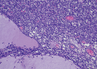 Fig. 1. Thymoma, dog. Sheets of neoplastic spindle cells are lining multifocal cystic lacunae. Hematoxylin and eosin. Table 1. Antibodies and immunohistochemical methods.