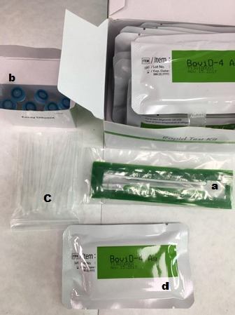 Fig. 1. Kit content: (a) swab stick, (b) tubes with diluent, (c) disposable droppers, and (d) BoviD-4 Ag test devices.