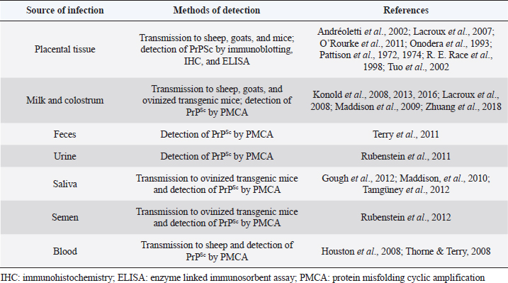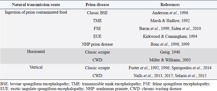 AbstractAnimal prion diseases are a group of neurodegenerative, transmissible, and fatal disorders that affect several animal species. The causative agent, prion, is a misfolded isoform of normal cellular prion protein, which is found in cells with higher concentration in the central nervous system. This review explored the sources of infection and different natural transmission routes of animal prion diseases in susceptible populations. Chronic wasting disease in cervids and scrapie in small ruminants are prion diseases capable of maintaining themselves in susceptible populations through horizontal and vertical transmission. The other prion animal diseases can only be transmitted through food contaminated with prions. Bovine spongiform encephalopathy (BSE) is the only animal prion disease considered zoonotic. However, due to its inability to transmit within a population, it could be controlled. The emergence of atypical cases of scrapie and BSE, even the recent report of prion disease in camels, demonstrates the importance of understanding the transmission routes of prion diseases to take measures to control them and to assess the risks to human and animal health. Keywords: Animal prion diseases, Scrapie, Bovine spongiform encephalopathy, Chronic wasting disease, Transmissible spongiform encephalopathies. IntroductionPrion diseases are a group of neurodegenerative disorders that affect humans and several animal species. These diseases are also known as transmissible spongiform encephalopathies (TSE) due to the microscopic changes they produce in the central nervous system (CNS) and their capability for transmission among susceptible individuals. Diseases within this group include Creutzfeldt Jakob disease (CJD) in humans, scrapie in sheep and goats, and bovine spongiform encephalopathy (BSE) in cattle, among others. All of them have a chronic course with neurological manifestations and culminate in the death of affected individuals since there is no curative treatment for these pathologies. The relevance of animal prion diseases has been changing over the years. BSE caused strong changes in animal production at the end of the 20th century, but its significance decreased with the implementation of measures to control it. However, BSE and other prion diseases are still being diagnosed worldwide, and a novel disorder designated as camel prion disease (CPD) was recently reported in dromedary camels from Algeria (Babelhadj et al., 2018). These findings indicated that prion diseases remain relevant for animal production and public health. Although the knowledge of animal prion diseases has increased drastically in the last years, many aspects remain poorly understood despite being studied in depth. Information about the spread of animal prion diseases became necessary for their control. This work aimed to compile and analyze information about the transmission routes of animal prion diseases within susceptible populations. Animal prion diseasesAnimal prion diseases have been known since 1732, when scrapie was described in a merino sheep in Spain, and later it was well documented in sheep from Great Britain (Liberski, 2012). During the 1960s, scrapie-like diseases were described in mink and deer in North America, later known as transmissible mink encephalopathy (TME) and chronic wasting disease (CWD) respectively. But it was in 1986 when animal prion diseases became more relevant. In that year, it was the first report about a disease similar to scrapie affecting cattle. That new disease was called BSE (Wells et al., 1987), and its impact was more significant than other prion diseases due to the economic importance of cattle. Interest in these pathologies increased significantly in 1996 when BSE was linked to a variant of the CJD in humans and was therefore considered a zoonosis (Will et al., 1996; Bruce et al., 1997). Because of the risk to animals and humans, strict measures to reduce the transmission of BSE were successfully implemented, and the number of new cases has decreased dramatically in recent years. Although prion diseases have been known for a long time, the etiological agent was characterized at the end of the 20th century when the prion hypothesis was postulated (Prusiner, 1982). It was proposed that scrapie is caused by a misfolded isoform of normal cellular prion protein (PrPC), which is found constitutively in nucleated cells of all superior species with a higher concentration in the CNS. The misfolded form was initially called protease resistant prion protein (PrPres) or scrapie prion protein (PrPSc). The conversion of PrPC to PrPres is a post-translational process that has not been completely elucidated yet. PrPres can be detected by several procedures. Immunoblotting, enzyme-linked immunosorbent assay, and immunohistochemistry are the most widely used methods in research and diagnosis (Gavier-Widén et al., 2005). New techniques have been developed, such as protein misfolding cyclic amplification (PMCA) and real time-quaking induced conversion (RT-QuIC). These consist of reproducing the conversion of PrPC to PrPres in vitro, using the PrPres present in infected samples. PMCA and RT-QuIC allowed them to advance in the knowledge of prion diseases since they have a higher sensitivity than other methods (Eraña et al., 2020). Considering all animal prion diseases, scrapie is the best known. It has been the prototype for studying prion diseases, and it is the most widespread, with the highest number of new cases reported. Additionally, although there has been no evidence of scrapie transmission to humans, it has been postulated as a potential risk for humans since it has been transmitted to primates and transgenic mice overexpressing human native PrPC (Cassard et al., 2014; Comoy et al., 2015). Beyond its hypothetical risk to other species, scrapie spread among small ruminants creates commercial barriers for sheep and goats, and their derived products. Nowadays, CWD has become th