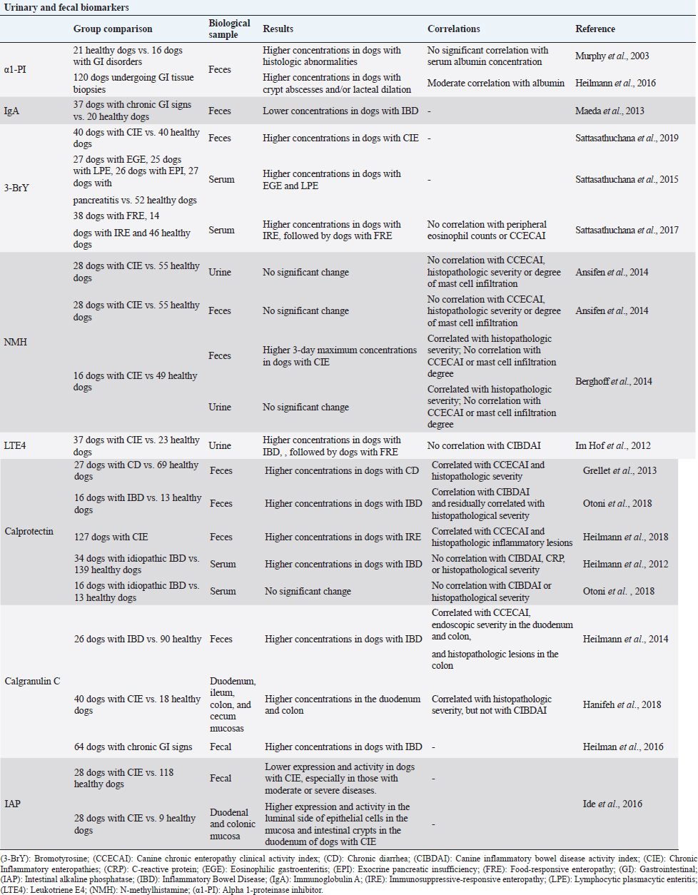 Table 2. Summary of the results obtained in clinical trials evaluating fecal and urinary biomarkers in dogs with chronic inflammatory enteropathies.