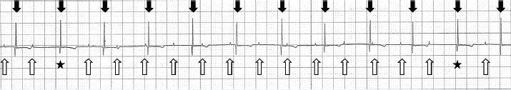 Fig. 1. Lead II trace on the biomonitor during anesthesia. The cat’s P waves are marked by upward arrows. The P-P intervals were consistent (0.52 seconds). The P waves that were followed by QRS complexes are indicated by asterisks. The rate of QRS complexes was 75 beats/minute (downward arrows) and their R-R intervals were consistent (0.8 seconds). QRS morphology was normal (duration, 0.04 seconds). Paper speed=25 mm/second; 1 cm=1 mV.