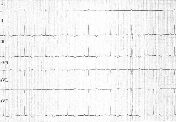 Fig. 3. ECG tracings from a 6-lead ECG examination of the cat during recovery from anesthesia. P waves were associated with QRS complexes. P-P intervals and R-R intervals were of the same duration (0.7 seconds). P-Q intervals were prolonged (duration, 0.16 seconds). QRS complex morphology revealed narrow, positive, enlarged complexes (amplitude, 1.7 mV; duration, 0.04 seconds). Paper speed=50 mm/second; 1 cm=1 mV. During recovery from anesthesia, the P waves gradually connected with the QRS complexes, finally ultimately associating with them (Fig. 3). The cat’s heart rate at this time was 85 beats/minute. Since the P-Q intervals were prolonged (duration, 0.16 seconds), the cat was diagnosed with first-degree AVB. Evaluation of QRS-complex morphology revealed enlarged narrow and positive waves, suggesting a left ventricular load pattern. During recovery, the cat’s heart rate returned to sinus bradycardia together with first-degree AVB without medical treatment. Magnetic resonance imaging (MRI) revealed meningoencephalitis, and computed tomography (CT) revealed fluid accumulation in the tympanic bulla. CT of the head, thorax, and abdomen did not reveal other diseases, such as hypothyroidism, which can also cause bradycardia. DiscussionThird-degree AVB is defined as a complete conduction disturbance between the sinus node and ventricles (Tilley, 1992; Kittleson and Kienle, 1998). It is usually permanent, with transient cases being rare. In both human beings and dogs, transient third-degree AVB was reported in cases of myocarditis due to Lyme disease (Levy and Duray, 1988; Kittleson and Kienle, 1998). Transient third-degree AVB in human beings has also been reported secondary to conditions other than Lyme disease (Rester and Bennett, 2005; Rotstein et al., 2008; Argun et al., 2018). Although there is a previous report of a cat that developed transient third-degree AVB in a study of third-degree AVB in cats, details of the transition from third-degree AVB to first-degree AVB were not reported in that study (Kellum and Stepien, 2006). This is the first case report describing the development and transition of transient AVB in detail. It has been previously reported that infectious myocarditis (viral, bacterial, protozoan, etc.) can induce arrhythmia and conduction disorders in both dogs and cats (Levy and Duray, 1988; Pisani et al., 1997; Meurs et al., 1998; Breitschwerdt et al., 1999; Bradley et al., 2000; Dvir et al., 2004). In this cat, although echocardiography was performed without ECG before anesthesia, there did not seem to be any atrioventricular conduction disturbance during echocardiography. Additionally, this cat did not have typical findings of infective endocarditis, and myocardial abnormalities were also not observed. Although myocarditis caused by parvovirus has been reported in dogs, parvovirus-induced myocarditis in cats has not been reported; this cat was also negative for feline leukemia virus (Pisani et al., 1997). Although Lyme disease, which can cause myocarditis and subsequent third-degree AVB, is caused by ticks, this cat received preventive therapy for ticks (Levy and Duray, 1988). In a previous report of Lyme disease in human beings in Japan, Yamaguchi Prefecture, where this cat resided, was declared free of Lyme disease. Therefore, the probability of this cat being infected with Lyme disease was low (National Institute of Infectious Diseases, 2019). CT and MRI examination showed no other systemic inflammatory disease other than meningoencephalitis and fluid accumulation in the tympanic bulla. Additionally, third-degree AVB developed following anesthesia induction, continuing during anesthesia maintenance, and finally transitioning from third-degree AVB to first-degree AVB at the time of anesthesia recovery. Therefore, this cat was diagnosed as third-degree AVB caused by anesthesia and not meningoencephalitis or fluid accumulation in the tympanic bulla. Although meningoencephalitis and fluid accumulation in the tympanic bulla might have promoted the AVB, the probability of third-degree AVB caused by meningitis is low. Our experience suggests that veterinarians should be aware of the probability of the development of third-degree AVB at the time of anesthesia in cases with suspected meningoencephalitis and fluid accumulation in the tympanic bulla. Since this cat’s heart rate improved slightly with isoproterenol, the recommended initial therapy for third-degree AVB, isoproterenol might have contributed to the transient nature of the third-degree AVB in this cat (Kittleson and Kienle, 1998). However, the development of third-degree AVB with anesthesia, transitioning to first-degree AVB at the time of anesthesia recovery, suggests that when third-degree AVB develops during anesthesia, as in this cat, anesthesia should be discontinued to reverse third-degree AVB. ConclusionIn cats, transient third-degree AVB can be caused by anesthesia, with the block improving by terminating anesthesia. In such cases, isoproterenol, which is used for treating transient third-degree AVB under anesthesia, might help to improve the heart rate. This is the first report describing transient third-degree AVB in detail. However, more data need to be accumulated to determine the etiology of transient third-degree AVB in such cases. Conflict of interestThe authors declare no potential conflicts of interest with respect to the research, authorship, and publication of this article. ReferencesArgun, M., Baykan, A., Özyurt, A., Pakokku, Ö., Üzüm, K. and Narin, N. 2018. Syncope due to complete atrioventricular block and treatment with a transient pacemaker in acute rheumatic fever. Turk. Pediatr. Ars. 53, 197–199. Bradley, K.K., Bergman, D.K., Woods, J.P., Crutcher, J.M. and Kirchhoff, L.V. 2000. Prevalence of American trypanosomiasis (Chagas disease) among dogs in Oklahoma. J. Am. Vet. Med. Assoc. 15, 1853–1857. Breitschwerdt, E.B., Atkins, C.E., Brown, T.T., Kordick, D.L. and Snyder, P.S