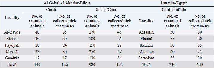 Fig. 1. Geographical map for Ismailia governorate, Egypt, and Al Gabal Al Akhdar in Libya. Table 1. Tick specimens collected from examined animals.