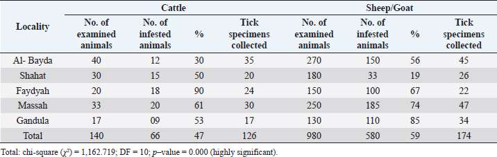 Tick collectionBefore the collection of tick samples, animals were restrained properly and their whole body was thoroughly inspected visually for the presence of ticks. Tick specimens were taken from predilection sites of the hosts, such as the ears, udder, and around the anus. The ticks collected from these sites with the help of forceps, and were transferred to bottles (containing either ethyl alcohol 70% and 10% glycerin or 70% alcohol only) and shifted to the laboratory for permanent slide preparation and identification based on the characters of the basis-capitulum, pedipalps, presence or absence of festoons, eyes, anal groove, adenal shields, coxa-1, coxa-IV, accessory adenal shields, and designs of colors present on scutum (Walker, 2003). Table 2. Prevalence of tick infestation on cattle and buffaloes at different localities in Ismailia, Egypt.