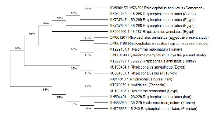 Morphological identificationThe method described by Farid et al. (2021) was adopted for the preparation of the tick specimens for light microscopy. Tick specimens preserved in an alcohol–glycerol mixture were taken and manually teased by forceps to remove any adherent host tissues. Blood from ticks was removed using a needle syringe. To dissolve more chitinous and other undesirable materials, the specimen was treated with 10% sodium hydroxide. After cleaning, the specimen was washed several times with water and subsequently dehydrated in a serial dilution of alcohol (25%, 50%, 75%, and 100% ethyl alcohol). To ensure better clearance, the specimen was kept in xylene for 15–30 minutes. The specimen was mounted on a glass slide using Canada balsam and covered by a cover slip, left to be dried in a hot oven at 40°C–50°C, and later examined under a light microscope (10× magnification). The specimens were morphologically identified according to Walker (2003). Molecular identification of ticksDNA extractionThe tick specimens preserved in 70% ethanol were processed for extraction of DNA. DNA was extracted utilizing QIAamp DNA Mini Kit (Qiagen), as per the protocol laid down by the manufacturer. Genomic DNA was stored at −20°C until use. Molecular identification of tick samples based on both 16S rDNA genesThe tick 16S rDNA was amplified from each specimen studied using conventional PCR methodologies and primers 5′-TTGGGCAAGAAGACCCTATGAA-3′ and 5′-CCGGGTTTGAACTCAGATCAAGT-3′, previously described by Black and Piesman (1994). The thermo-cycling cycling conditions were: initial denaturation at 95°C for 5 minutes. followed by 10 cycles of 92°C for 1 minute, 48°C for 1 minute, and 72°C for 90 seconds. This step was followed by an additional 32 cycles of 92°C for 1 minute, 54°C for 35 seconds, and 72°C for 90 seconds., this was followed by a final extension at 72°C for 7 minutes. The amplification products from 16S rDNA PCR were made to electrophoretically migrate on a 1.6% agarose gel containing 0.4 µg/ml of ethidium bromide at 90 volts for 40–60 minutes. Sequence analysisThe amplified PCR products were excised from the gel, purified, and sent for sequencing. Sanger sequencing was performed by Solgent Co. Ltd (South Korea). Sequences were then analyzed using BLAST® (Johnson et al., 2008). Phylogenetic analysisPhylogenetic analysis and estimates of evolutionary divergence between sequences were performed based on the 16S rDNA gene sequences of several closely related tick species. They were constructed in MEGAX (Kumar et al., 2018). Ethical approvalThis study was approved by the Ethics Committee of the Suez Canal University. All animal experiments were conducted following the guidelines of the Guide for the Care and Use of Laboratory Animals, Faculty of Veterinary Medicine Science, Suez Canal University, Egypt with approval number (2018123). ResultsPrevalence of tick infestationIn Ismailia, Egypt, 23.9% of the 230 animals (cattle and buffaloes) examined for tick infestations had one species of hard tick, Rhipicephalus annulatus. Table 2 shows the prevalence of R. annulatus infection in the studied animals across different locations in Ismailia province. In the Libyan province of Al Gabal Al Akhdar, the prevalence of tick infestation in cattle, both sheep and goats, was 47% (66/140) and 59% (580/980), respectively. Rhipicephalus annulatus is the identified tick species for cattle. Hyalomma marginatum and Rhipicephalus bursa are the identified tick species for the infested sheep and goats. Table 3 shows the percentage of animals with tick infection among those investigated at various locations throughout Libya’s Al Gabal Al Akhdar province. The morphology of the collected tick species using a light microscopeHyalomma marginatum rufipes (Koch, 1844): the scutum color was dark (Fig. 1), the male had adenal and accessory adenal shields (Fig. 2), and the basis capitulum had medium angular lateral margins. Palp articles 2 were longer than articles 1 and 3 (Fig. 3), and festoons were absent in the male and un-engorged female (Fig. 3). The spiracular plate was large and posterior to the legs (Fig. 4). The genital aperture anterior groove was deep, and the genital aperture posterior lips had a V shape (Fig. 2). Table 3. Prevalence of tick infestation on animals across different localities of Al Gabal Al Akhdar, Libya.