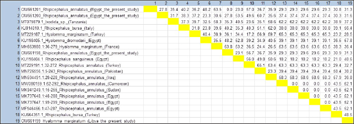 Fig. 10. Estimates of evolutionary divergence between this study tick sequences and sequences of tick spp. 16S r DNA. On the other hand, concerning phylogeny, mtDNA sequences are a good phylogenetic marker for groups of organisms that have diverged relatively, based on their higher rate of base substitution than most nuclear markers (Parola and Raoult, 2001). Even though Black and Piesman (1994) reported that errors in the construction of phylogenies can happen by mistake when the mitochondrial gene transfers to the nucleus as mitochondrial pseudogenes (called numts), which are the problem of the mitochondrial gene. ConclusionIn this study, the 16S rDNA gene sequencing and phylogenetic analysis of sample species from Egypt and Libya proved instrumental in overcoming the difficulties associated with morphological identification techniques. Therefore, using mitochondrial genes is a good marker in tick species identification. The changes in environmental conditions affect tick development. Therefore, this idea will help in devising a better strategy for the control of ticks among livestock by providing useful insights into the epidemiology of these parasites. Conflict of interestThe authors have no conflicts of interest relevant to this article. Availability of data and materialAll data generated or analyzed during this study are included in this article. FundingNo funding was received for this study. Authors’ contributionAll authors contributed to the preparation of the manuscript. ReferencesAbouelhassan, E.M., El-Gawady, H.M., Abdel-Aal, A.A., El-Gayar, A.K. and Esteve-Gassent, M.D. 2019. Comparison of some molecular markers for tick species identification. J. Arthropod. Borne. Dis. 13, 153. Alessandra, T. and Santo, C. 2012. Tick-borne diseases in sheep and goats: clinical and diagnostic aspects. Small. Rum. Res. 106, S6–S11. Black, W. and Piesman, J. 1994. Phylogeny of hard-and soft-tick taxa (Acari: Ixodida) based on mitochondrial 16S rDNA sequences. In: Proceedings of the National Academy of Sciences, 91, pp 10034–10038. Dantas-Torres, F. 2018. Species concepts: what about ticks? Trends. Parasitol. 34, 1017–1026. Dantas-Torres, F., Giannelli, A., Figueredo, L.A. and Otranto, D. 2010. Effects of prolonged exposure to low temperature on eggs of the brown dog tick, Rhipicephalus sanguineus (Latreille, 1806) (Acari: Ixodidae). Vet. Parasitol. 171, 327–330. Dantas-Torres, F., Latrofa, M.S., Annoscia, G., Giannelli, A., Parisi, A. and Otranto, D. 2013. Morphological and genetic diversity of Rhipicephalus sanguineus sensu lato from the new and old worlds. Parasit. Vectors. 6, 1–17. Farid, D., Abouelhassan, E., El-Sebae, A., Enany, M. and Youssef, A. 2021. Ectoparasite fauna of commensal rodents collected from the North Sinai governorate, Egypt and its public health significance. Adv. Anim. Vet. Sci. 9, 563–570. Gebre, S., Nigist, M. and Kassa, B. 2001. Seasonal variation of ticks on calves at Sebeta in western Shewa Zone. Ethiop. Vet. J. 7, 17–30. Johnson, M., Zaretskaya, I., Raytselis, Y., Merezhuk, Y., McGinnis, S. and Madden, T.L. 2008. NCBI BLAST: a better web interface. Nucleic. Acids. Res. 36, W5–W9. Kumar, S., Stecher, G., Li, M., Knyaz, C. and Tamura, K. 2018. MEGA X: molecular evolutionary genetics analysis across computing platforms. Mol. Biol. Evol. 35, 1547. Makala, L.H., Mangani, P., Fujisaki, K. and Nagasawa, H. 2003. The current status of major tick borne diseases in Zambia. Vet. Res. 34, 27–45. Marufu, M.C. 2008. Prevalence of ticks and tick-borne diseases in cattle on communal rangelands in the highland areas of the Eastern Cape province, South Africa. Alice, South Africa: University of Fort Hare. Parola, P. and Raoult, D. 2001. Ticks and tickborne bacterial diseases in humans: an emerging infectious threat. Clin. Infect. Dis. 32, 897–928. Pegram, R.G., Hoogstraal, H. and Wassef, H.Y. 1981. Ticks (Acari: Ixodoidea) of Ethiopia. I. distribution, ecology and host relationships of species infesting livestock. Bull. Entomol. Res. 71, 339–359. Rajput, Z., Hu, S.H., Arijo, A., Habib, M. and Khalid, M. 2005. Comparative study of Anaplasma parasites in tick carrying buffaloes and cattle. J. Zhejiang. Univ. Sci. B. 6, 1057. Uilenberg, G. 1995: International collaborative research: significance of tick-borne hemoparasitic diseases to world animal health. Vet. Parasitol. 57, 19–41. Walker, A.R. 2003. Ticks of domestic animals in Africa: a guide to identification of species. Biosci. Rep. Edinb. 3, 210. | ||