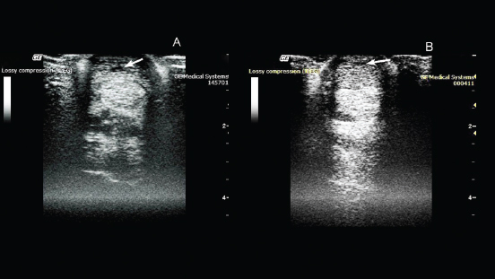 Fig. 1. Ultrasonography of the superficial digital flexor. (A): Before the introduction of plasmid DNA. (B): 20th day after the introduction of plasmid DNA. ResultsTherapeutic efficacy and the regenerative effect of the drug (pDNA) on connective tissues were studied in a 2-year-old pure-bred Arabian stallion with damage to the superficial extensor. During clinical examination, it was observed that the horse was limping on the left forelimb. The degree of lameness was rated 2 out of 5 (according to the 5-point lameness scale (2) AAEP). The pronounced anechoic and hypoechoic zones at the back of the limb was visualized using ultrasound examination of the damaged leg (Fig. 1). A diagnosis of tendonitis of the superficial digital flexor was made. On the 10th day after pDNA administration, clinical examination confirmed no lameness on the previously affected left forelimb. An ultrasound examination of the superficial digital flexor revealed increased echogenicity in the damaged area, indicating heterogeneity of the structure in the damaged area, due to the formation of connective tissue.