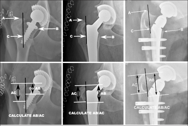Fig. 1. A VRL (black) was defined distally by the most distal medial aspect of the intertrochanteric fossa (point C). The proximal end of the line was defined by making the line tangential to the medial aspect of the greater trochanter. Three points were then identified on the proximal femur. The most proximal aspect of the greater trochanter was identified (point A) and a line perpendicular to the VRL was drawn through this point and accordingly named line A. Next, the most distal-medial aspect of the femoral osteotomy was identified (point B). A line perpendicular to the VRL was established through this location and was named line B. Lastly, a line perpendicular to the VRL was established through the aforementioned point C, the most distal medial aspect of the intertrochanteric fossa, and was named line C. The distances between lines A and B and A and C were measured and the ratio of the length AB to AC was calculated (AB/AC ratio). Larger ratios were considered consistent with a more distal osteotomy and small ratios were considered indicative of a more proximal osteotomy. Representative images of Helica (far left), BFX (middle), and Zurich (right) THRs are included. This was a radiograph review study of client-owned dogs that underwent a THR. All owners provided written consent for surgical treatment (THR) of their dog. ResultsThe r-value assessing the correlation between observers 1 and 2 was 0.72. The r-value assessing correction between observers 1 and 3 was 0.87, and the r-value assessing correction between observers 2 and 3 was 0.60. The mean AB/AC ratio for the femurs implanted with a Helica prosthesis was 0.75 (±st. dev. 0.22), 0.97 (±0.13) for the femurs implanted with a BFX femoral component, and 1.1 (±0.15) for the Zurich system (smaller ratios are indicative of a more proximal osteotomy). Based on the Mann–Whitney rank sum test, the difference between the Helica and BFX systems was statistically significant ( p=0.00009). The difference between the Helica and Zurich system was statistically significant ( p=0.00024). Lastly, the difference between the BFX and Zurich systems was statistically significant (p=0.025) with the BFX having a more proximal osteotomy. DiscussionThe first objective of this study was to develop and validate a method for quantifying the level of the osteotomy at its most distomedial aspect in conjunction with canine THR. The landmarks used were based in part on landmarks previously described for assessing the BFX femoral prosthesis (Lascelles et al., 2010). Those investigators used a VRL in the cranial-caudal view that was placed along the lateral aspect of the BFX stem and which was very similar to the VRL along the medial aspect of the intertrochanteric fossa in this study (Lascelles et al., 2010). In addition, those investigators used the most distal medial aspect of the intertrochanteric fossa immediately adjacent to the BFX stem as a reference point for assessing subsidence of the BFX implant (Lascelles et al., 2010). We used that same point (point C) in this study. The other landmarks that we chose for this study were selected based upon their ease of identification and their clinical relevance. The proximal aspect of the greater trochanter is readily identifiable and therefore was considered a good choice for one reference location. Similarly, the distomedial aspect of the osteotomy is radiographically apparent and is clinically relevant as presence of sufficient bone in the calcar region may affect feasibility of THR revision. The results from this study indicate that the landmarks we used could be reproducibly identified by different observers, even when including observers with little veterinary surgical experience. This conclusion is supported by the strong to very strong correlations. As a result, we accepted our first hypothesis and concluded that the landmarks used were radiographically identifiable and the methodology developed was adequately precise. The second objective of this study was to compare the level of the distomedial aspect of the osteotomy among three different THR systems. The data showed that the osteotomy was significantly higher with the short-stemmed Helica system than with both of the long-stemmed prostheses (BFX and Zurich). This result is plausible, if not intuitive, given that with the Helica system the surgeon removes the femoral head and places the prosthesis within the femoral neck, rather than placing the implant into the femoral diaphysis. However, confirmation, rather than assumption, that bone stock is preserved at the distomedial aspect of the osteotomy with the Helica THR is relevant because this could facilitate revision to a long-stemmed prosthesis if a complication were to occur. Indeed, in human medicine, one of the motivations for use of neck-preserving hip resurfacing prostheses in young patients is the preservation of bone stock and ability to revise to a long-stemmed prosthesis when the index implant wears (Clough and Clough, 2021). Although this may be a less common consideration in canine medicine, it is relevant as an increasing number of reports describe performing THR in juvenile dogs, coupled with reports of canine THR implant wear, breakage, or need for revision (Guerrero and Montavon, 2009; Fitzpatrick et al., 2014; Vezzoni et al., 2015; Ficklin et al., 2016; Nesser et al., 2016; DiVincenzo et al., 2017; Vezzoni et al., 2017). These publications indicate that preservation of bone stock and the ability to revise the THR is clinically relevant for some dogs. The data also indicated that the osteotomy performed with the BFX THR was significantly more proximal than that made with the Zurich THR. This comparison was motivated in part by a previous study in which the first author transitioned from the BFX to the Zurich system and recognized that (subjectively) reduction of the Zurich femoral implant was consistently challenging, that the neck prostheses applied in that study were shorter than 
