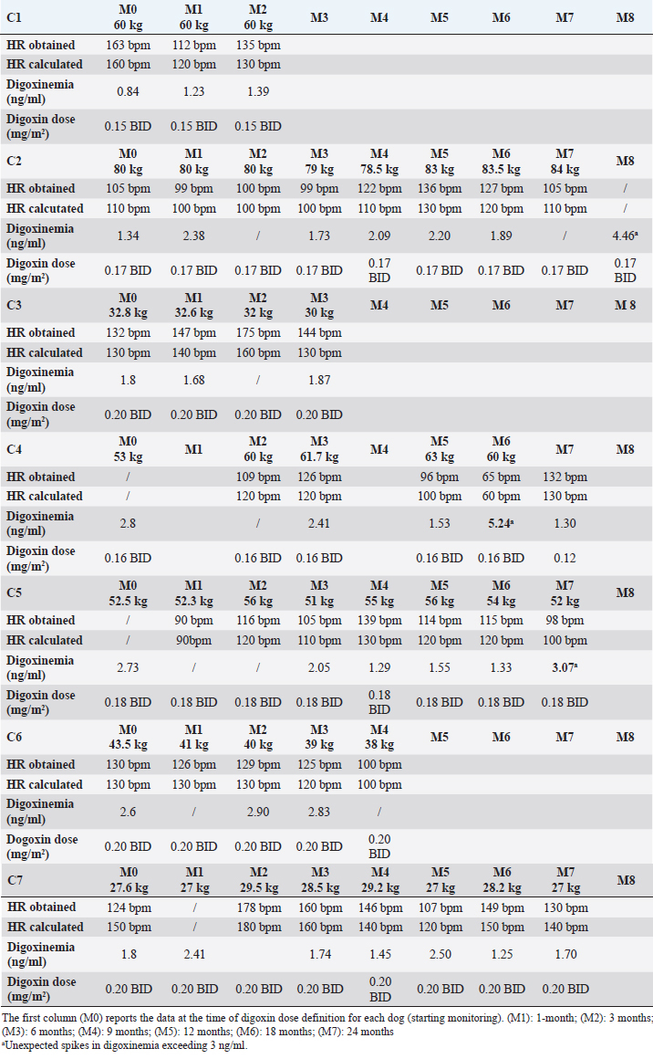 AbstractBackground: Atrial fibrillation (AF) is the most common arrhythmia in dogs, most frequently diagnosed as chronic AF associated with a structural heart disease. The therapeutic strategy, in these cases, is based on the heart rate control and digoxin is one of the most used drugs. Aim: The aim of this work was to study the serum digoxin concentration changes in dogs with AF under long-term treatment with digoxin. Furthermore, the remission of clinical signs and the correlation between digoxinemia and other clinical and laboratory variables were retrospectively evaluated. Methods: The prospective study was conducted on seven large breed dogs from the time of reaching the definitive digoxin dosage. Digoxinemia was determined at month: 1, 3, 6, 9, 12, then twice a year. A post hoc statistical analysis investigated the influence of selected clinical and laboratory variables on the risk to develop spikes in digoxinemia. Clinical data, heart rate, digoxin dosage (mg/m2), and digoxinemia (ng/ml) at all available follow-ups were retrospectively evaluated from the medical records of 17 further dogs and a linear regression analysis was performed on the whole data set. The relation between the time of remission of AF clinical signs and variables was also investigated. Results: An unexpected increase in digoxin serum concentration was recorded in three dogs after one year monitoring, in absence of digoxin dosage changes. No statistical significance of all the studied variables on the risk to develop spikes of digoxinemia was registered. Two dogs, reaching digoxinemia 4.46 and 5.24 ng/ml, showed symptoms that reversed after digoxin withdrawal. From retrospective data, 88% of dogs reached complete reverse of AF clinical signs in 2.1 months from digoxin treatment starting, regardless of digoxin initial dosage, digoxinemia, and heart rate. Conclusion: Digoxin in monotherapy remain a good option to treat AF in dogs, anyway digoxin toxicity could emerge during long-term therapy, similarly to what happen in human medicine. Life-threatening spikes of digoxinemia could occur, especially after 1-year treatment with digoxin. It is very important that practitioners be aware of this possibility and encourage the owners to monitor digoxinemia during long-term treatment to avoid dangerous and toxic effects. Keywords: Atrial fibrillation, Digoxin, Digoxin serum concentration, Dogs. IntroductionAtrial fibrillation (AF) is the most common arrhythmia in dogs with a recently reported incidence of 33.7% of all arrhythmias found on electrocardiographic examination (ECG) (Noszczyk-Nowak et al., 2017). It is related to a high mortality rate if left untreated (Bonagura, 1986; Stokhof and van den Brom, 1990; Jung et al., 2016; Pedro et al., 2018). This arrhythmia is characterized by a rapid, chaotic and disorganized atrial electrical activity, which results in the loss of an effective contraction of the atria, functional to ventricular diastolic filling, and high ventricular rate (Pedro et al., 2020a). The main hemodynamic consequences are a reduction in cardiac output and increased atrial filling pressures with the development or worsening of clinical signs of congestive heart failure (CHF) (Saunders et al., 2009). AF is most frequently diagnosed in association with underlying structural heart diseases, and it is often associated with CHF (Pariaut, 2017; Ward et al., 2019). Atrial enlargement, fibrous remodeling, elevated adrenergic tone, and activation of the renin–angiotensin–aldosterone system represent irreversible changes that promote the onset and maintenance of AF (Pariaut, 2017). Once established, AF contributes to further deterioration of cardiac function mainly due to the rapid and irregular ventricular response rate (VRR) which is the result of high adrenergic tone associated with a reduced ability of the atrioventricular node to block atrial impulses (Pariaut, 2017). In canine clinical practice, AF is a well-known and frequent arrhythmia. Scientific papers on dogs have been recently published documenting and discussing the association between AF and clinical signs of right CHF, the association between a post-treatment low heart rate (HR) and a longer survival time (Pedro et al., 2018; Ward et al., 2019). The role of AF as a prognostic factor in dogs with myxomatous mitral valve disease (MMVD) and dilated cardiomyopathy (DCM) in Dobermans has been investigated (Friederich et al., 2020; Guglielmini et al., 2020). Up until now, the primary therapeutic aim to treat AF in veterinary medicine is the maximization of cardiac output through two treatment strategies: the HR control or the conversion of AF to sinus rhythm (Saunders et al., 2009; Pariaut, 2017; Pedro et al., 2020a,b). The latter is reserved for a few cases (i.e., idiopathic AF), while in most cases (chronic AF associated with structural heart disease) the treatment strategy involves the use of drugs aimed to decrease VRR. Digoxin alone or in combination with other medications is one of the most commonly used drug to treat AF in dogs (Pariaut, 2017). However, prospective clinical trials including long-term safety of digoxin are missing as reported in a recent review from Pedro and collaborators (2020b). It is known from human medicine that digoxin toxicity emerges mostly during long-term therapy and that clinical features of toxicity are often nonspecific with lethargy, gastrointestinal signs, neurological symptoms, or arrhythmias that could be fatal (Tatlisu et al., 2015; Pincus, 2016). The purpose of the present work was to study the changes of serum digoxin concentration in dogs with DCM and AF under long-term treatment with digoxin. Furthermore, data from other dogs under digoxin treatment were retrospectively studied to evaluate the reversal of clinical signs and the correlations of digoxinemia with clinical, laboratory and instrumental variables. Materials and MethodsProspective studyIn dogs with a diagnosis of chronic AF, having the owners