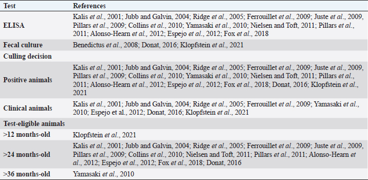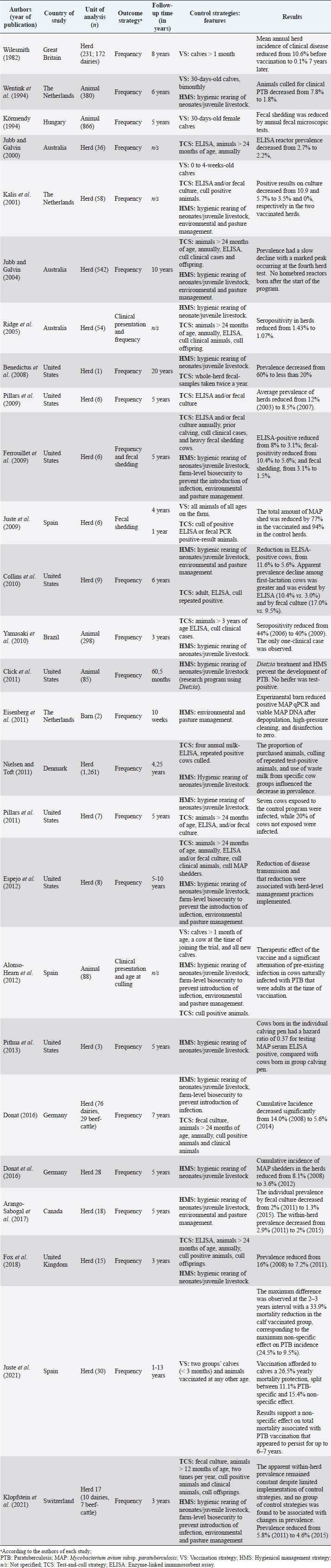Table 3. Description of TCS for paratuberculosis control in dairy cattle, extracted from the selected studies (n =26) of the SystRev.