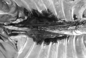 Fig. 11. NMB and ioversol longitudinal bilateral thoracic paravertebral spread in a cat cadaver. Ventral view.
