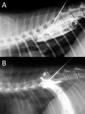 Fig. 10. NMB and ioversol mixed longitudinal and cloud-like (A) and intercostal (B) spread pattern in a lateral radiograph of a cat cadaver.