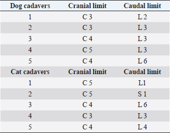 AbstractBackground: Thoracic paravertebral block (TPVB) entails injecting a local anesthetic inside the thoracic paravertebral space (TPVS). Loss of resistance to air injection (air-LOR) was the first technique described in humans to locate the TPVS. To date, no study has investigated the spread of any substance after injection into the TPVS using the air-LOR technique nor has described the cranial and caudal limits of the space. Aim: To identify the boundaries of the TPVS, to determine whether the air-LOR technique is reliable for the identification of the TPVS and to examine the relationship between the volume of injectate and its spread. Methods: After a preliminary phase, the thorax of five cat and five dog cadavers was accessed and eviscerated. After TPVS probing, the polyurethane foam was injected, and the cranial and caudal borders were recorded after its maximum spread. Different volumes of a mixture of new methylene blue and ioversol were injected in the TPVS after its localization with a Tuohy needle and air-LOR technique in fourteen dog and six cat cadavers. Lateral radiographs of the vertebral column were used to document needle positioning, spread pattern and extension. The thorax of these subjects was then accessed and eviscerated to observe and record the spread of the mixture. Results: Injecting a dye into the TPVS, localized by an air-LOR technique, resulted in multi-segmental and often bilateral subpleural staining of paravertebral, intercostal, and dorsal mediastinal structures in dog and cat cadavers. The lateral radiographs most often showed a mixed cloud-like and linear spread pattern, which could be a predictor of the longitudinal spread of the dye. The foam injected into the TPVS at the cranial and the caudal level revealed anatomical communication with the cervical, axillar, and lumbar paravertebral regions. Conclusion: TPVS localization by air-LOR technique and injection results in a longitudinal multi-segmental spread in dog and cat cadavers. The communication of the TPVS with the axillary and lumbar regions could be of clinical interest for the brachial plexus and the lumbar intercostal nerve blocks in a clinical setting. Keywords: Loss of resistance, Pet, Regional anesthesia, Thoracic paravertebral block, Thoracic paravertebral space. IntroductionSeveral studies describe the advantages of loco-regional techniques over systemic administration of analgesic drugs in terms of better analgesia and less stress response in both humans (Richman et al., 2006; Macfarlane et al., 2009) and dogs (Sibanda et al., 2006; Romano et al., 2016). Described for the first time in 1905 (Richardson and Lönnqvist, 1998), thoracic paravertebral block (TPVB) entails injecting a local anaesthetic adjacent to the thoracic vertebrae, where the spinal nerves emerge from the intervertebral foramina. Anatomically investigated and thoroughly described in humans and rats (Karmakar, 2001; Pintaric et al., 2012), but not in dogs and cats, this region is defined as the thoracic paravertebral space (TPVS), even though it can be considered only a virtual space. This area is divided into two different compartments by a thin connective layer named the endothoracic fascia, and several important nervous structures run in each of these. The subendothoracic (dorsal) compartment contains the spinal nerves and the rami communicantes, whereas in the extrapleural (ventral) one runs the sympathetic chain with its ganglia (Pintaric et al., 2012). The injection of a local anesthetic at this level results in ipsilateral somatic and sympathetic nerve blockade in multiple contiguous thoracic dermatomes cranial and caudal to the injection site (Richardson et al., 1998; Saito et al., 2001). TPVB is indicated as a perioperative anesthetic and analgesic technique in humans, mainly in breast surgery (Terkawi et al., 2015), and thoracotomy (Yeung et al., 2016). In fact, it provides equivalent analgesia with the same or fewer side effects than thoracic epidural analgesia (Davies et al., 2006; Scarci et al., 2010). Studies on the longitudinal spread after a single injection and the cranial and caudal boundaries of TPVS in humans have produced inconsistent results (Karmakar, 2001; Bouman et al., 2017). While several techniques have been described for this block (Naja et al., 2011; Fujii et al., 2017; Ruscio et al., 2019), the “standard” (Richardson and Sabanathan, 1995) involved eliciting loss of resistance to air injection (air-LOR) in order to confirm the correct positioning of the Tuohy needle in the TPVS. In 2002 Saito et al. (2002) demonstrated the efficacy and lumbar spread of TPVB in rabbits, suggesting the block could be useful in Veterinary Medicine. The literature about TPVB in small animals is increasing over time (Saito et al., 2002; Portela et al., 2012, 2017; Monticelli et al., 2017; Ferreira et al., 2018; Serra et al., 2019), yet no study to date has investigated the spread of any substance after its injection into the TPVS using the air-LOR technique or has described the cranial and caudal limits of the space. The primary aim of this study was to identify the caudo-cranial boundaries of the TPVS after injecting polyurethane foam, and to determine whether the air-LOR technique is reliable for identifying the TPVS and producing longitudinal spread in dog and cat cadavers. The secondary aim was to examine the relationship between the injected volume and the number of vertebrae stained after ioversol and new methylene blue (NMB) injection into the TPVS of dog and cat cadavers. Materials and MethodsPolyurethane foam study - preliminary phaseTwo cat and two dog cadavers of different breeds and weights were studied within 5 hours after euthanasia for clinical reasons. Animals with a history or evidence of thoracic pathologies or trauma were excluded from the study. After anatomical isolation of the region of the thoracic vertebrae (the vertebral column, muscle and skin of the dorsum, proximal tract of the ri